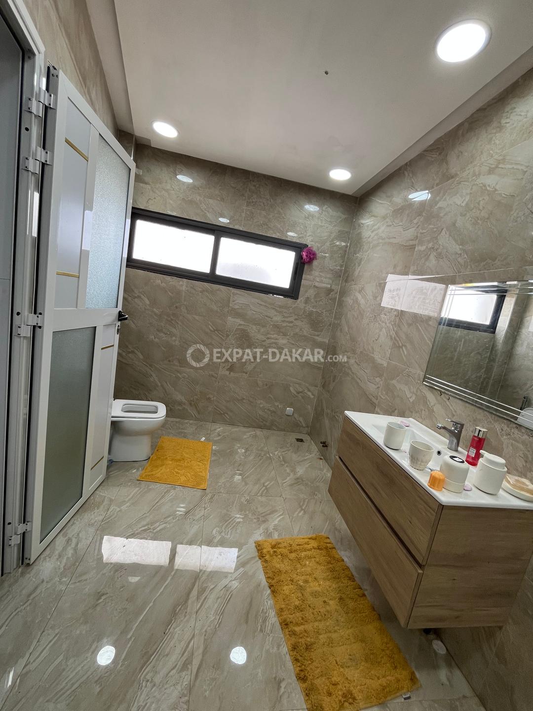 Duplex grand standing composé au RDC : Un grand salon climatisé avec une grande baie vitrée qui offre une magnifique vue, une salle à manger, une cuisine africaine et une cuisine américaine semi équipée, une buanderie, un débarras, un espace familial, un garage, une chambre avec sa salle d'eau incorporée et une toilette visiteurs Au 1er étage : Une grande chambre parentale climatisée avec un balcon, un dressing et une salle d'eau avec une baignoire, quatre autres chambres climatisées avec leur salle d'eau incorporée + des balcons, un espace familial et une toilette visiteurs. Le tout à louer à Sotrac Mermoz derrière la maison du président Diomaye dans une cité fermée, sécurisée et très accessible à seulement 1500000